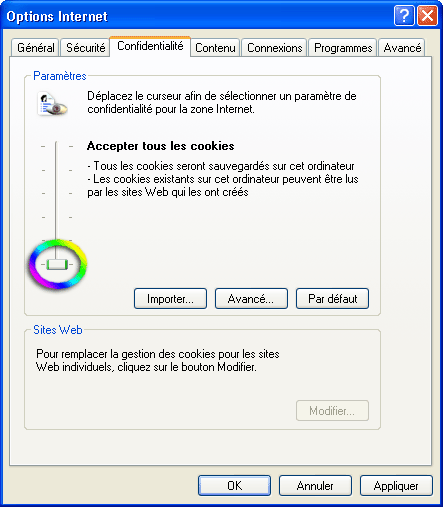 Marche � suivre : - Allez dans le menu "Outils" de votre navigateur et s�lectionnez l'�l�ment "Options internet..." - Dans la boite de dialogue, choisissez l'onglet "Confidentialit�". - Modifiez vos param�tres (cf. illustration ci-contre) puis cliquez sur le bouton OK. |